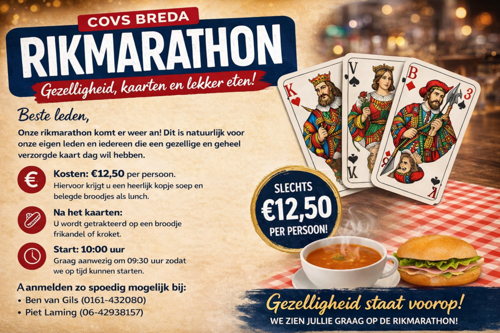 Beste leden, Onze rikmarathon komt er weer aan! Dit is natuurlijk voor onze eigen leden en iedereen die een gezellige en geheel verzorgde kaart dag wil hebben. Kosten zijn voor […]