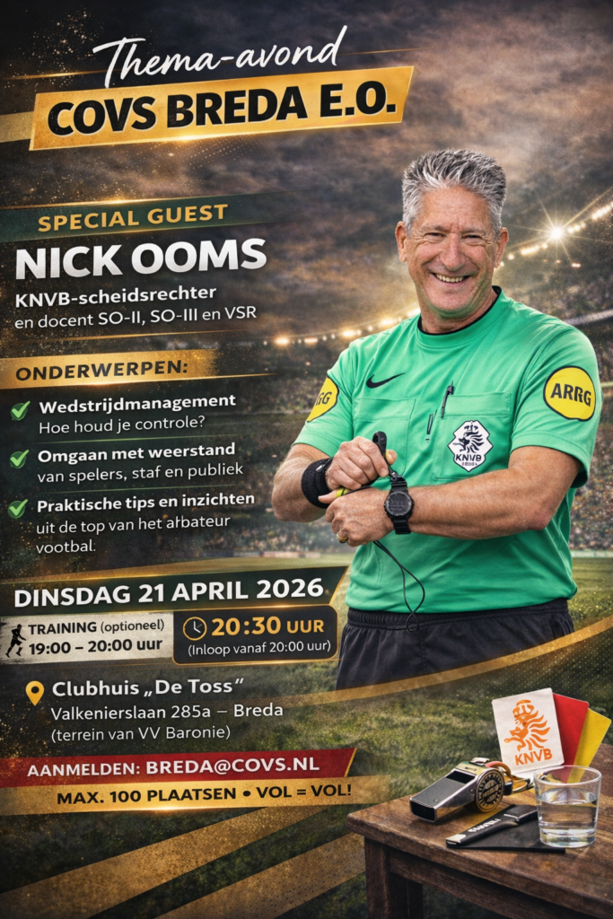 Met Nick Ooms – KNVB-scheidsrechter en docent SO-II, SO-III & VSR. Thema’s: Wedstrijdmanagement, omgaan met weerstand ; praktische tips en inzichten. Mis het niet!